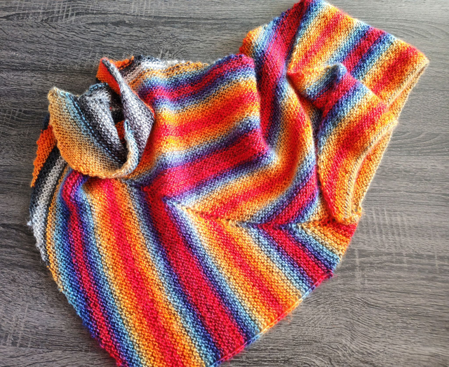 Un très grand tour de cou triangulaire légèrement asymétrique tricoté avec un fil acrylique multicolore.