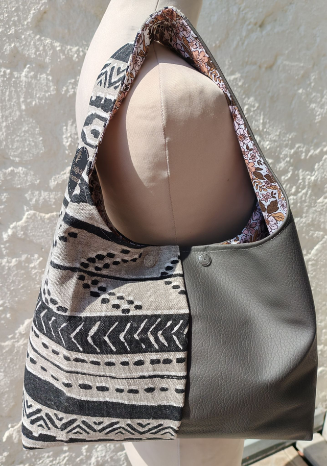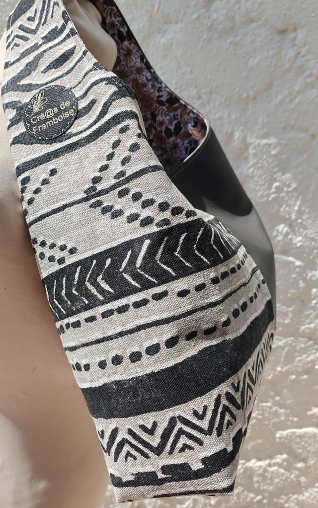Sac qui peut être porté soit à la main soit à l'épaule. Il est réalisé dans une toile tapisserie, doublé d'un coton à motif floral.